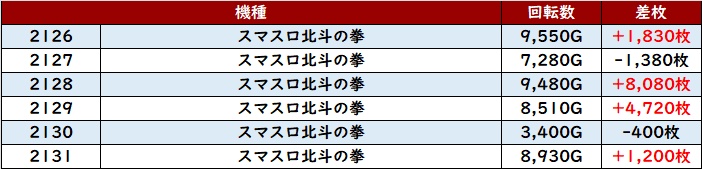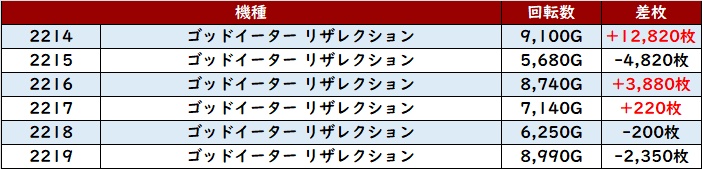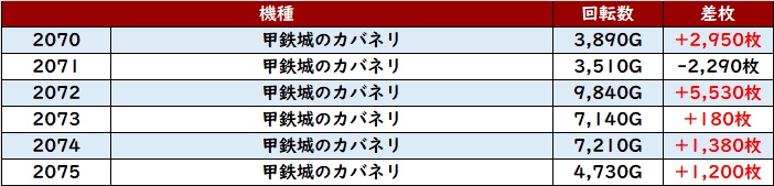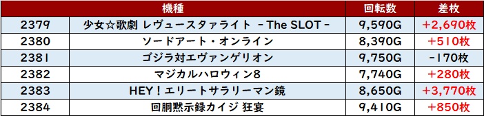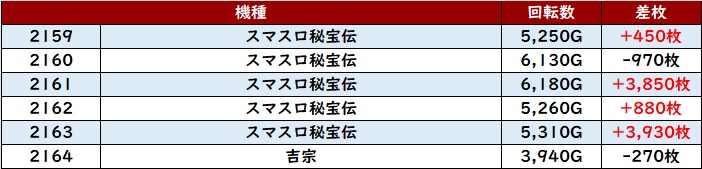 こちらも殆どが回転数1万G超えと抜群の稼働状況となっており、差枚数+11,650枚差枚数+8,160枚と大きく出玉感を伸ばす台が多く見られた。