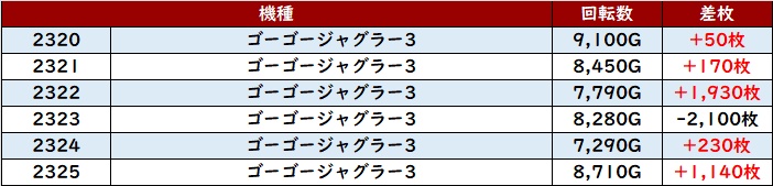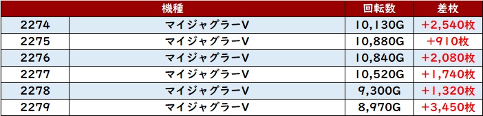まずは「マイジャグ5 2274~2279」半数以上が回転数1万G超えと凄まじい勢いに!