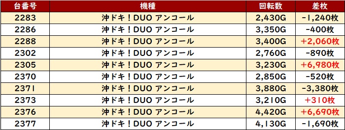 続いて「沖ドキDUO2」から驚異の差枚数+6,600枚超えを複数確認!