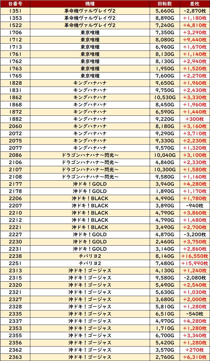 その他機種からもスマスロメダル機関係なく好調台が多数現れ、中でも「チバリヨ2」差枚数+1.5万枚超え2台と破壊力抜群の出玉感を叩き出し、一際目立っていた!