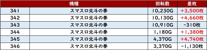 まずは「スマスロ北斗 341~346」の大半が大幅プラス差枚と絶好調に!