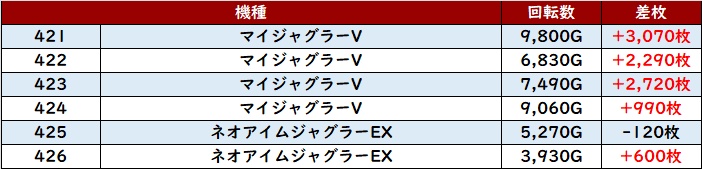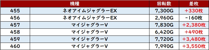続いて「マイジャグ5~ハッピー3 421~426」「ネオアイム~マイジャグ5 455~460」の半数が差枚数+2,200枚超えと申し分ない結果に!