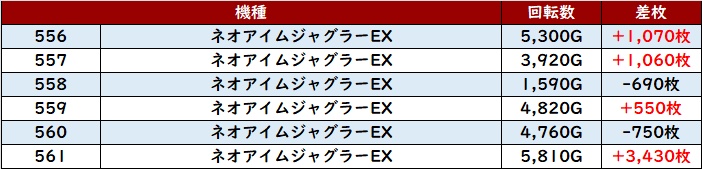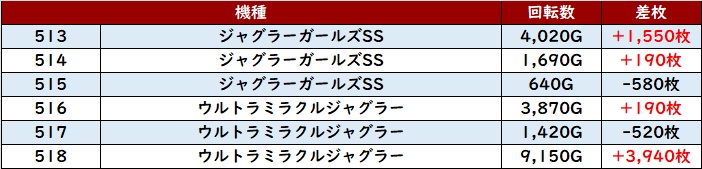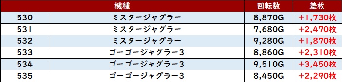 まずは「ミスター~ゴージャグ3 530~535」全台大幅プラス差枚と安定感ある結果に!