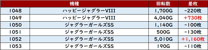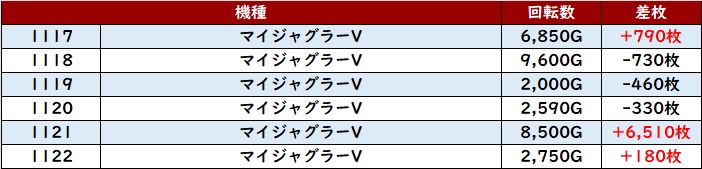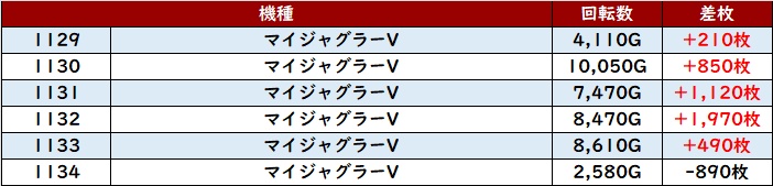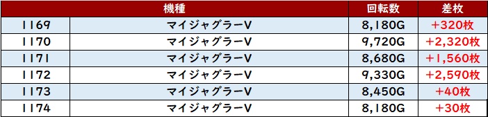 続いて「マイジャグ5 1169~1174」全台プラス差枚を記録!