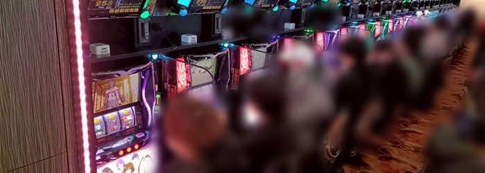 朝イチは「ヴヴヴ2」「東京喰種」などの人気機種や、新台の「スマスロ化物語」「スマスロ秘宝伝」「沖ドキDUO2」を中心として、多くの台が満席となった。