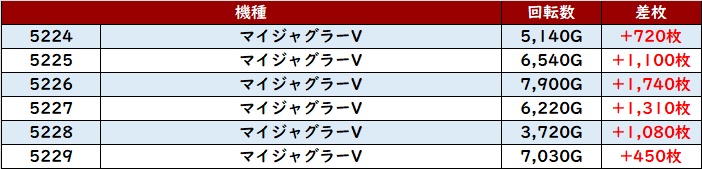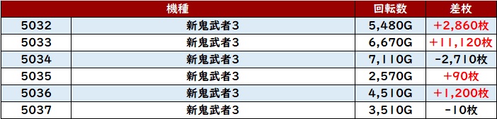 全台回転数7,300G超えに加え、差枚数+5,500枚超えが2台と好調さをアピールしていた。