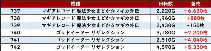 続いて「マギレコ~スマスロゴッドイーター 737~742」も機種跨ぎで目を見張る出玉感を記録!