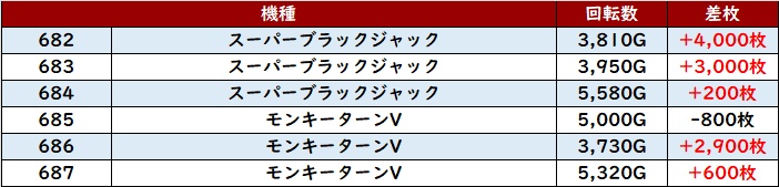 続いて「スーパーブラックジャック~モンキー5 682~687」の半数が差枚数+2,900枚以上と絶好調!