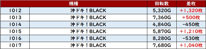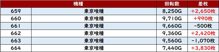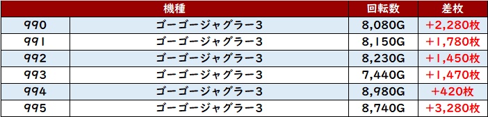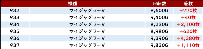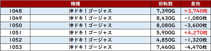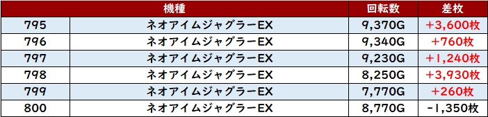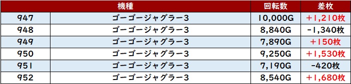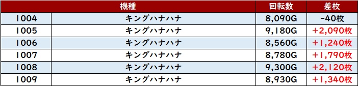 12台中10台がプラス差枚という優秀な勝率に加え、殆どが回転数8,000G超えの抜群の稼働状況を見せた。