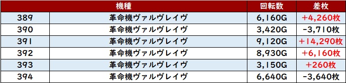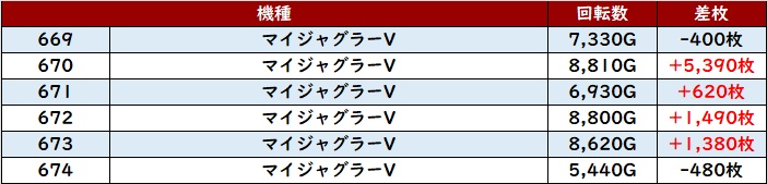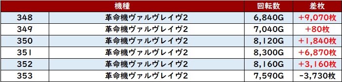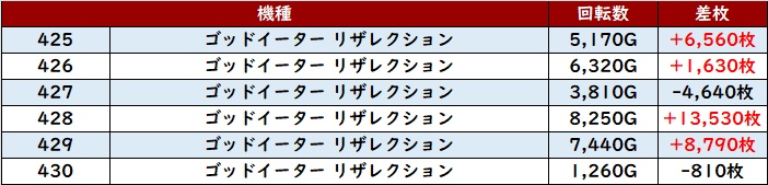 6台中5台が大幅プラス差枚且つ差枚数+15,810枚など驚異的な数値で盛り上がりに大きく貢献していた。