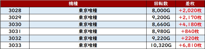 続いて「東京喰種 3028~3033」も全台回転数8,000G以上の高稼働を記録!