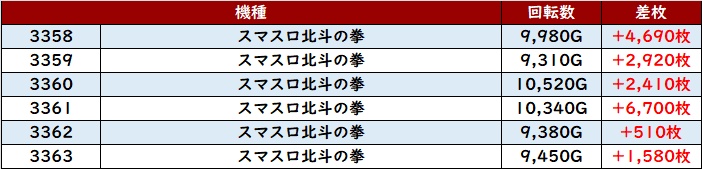 まずは「スマスロ北斗 3358~3363」がメイン機種たる所以を示す結果に!