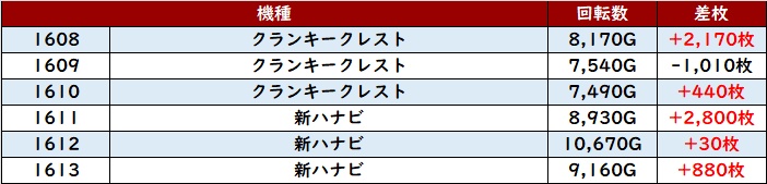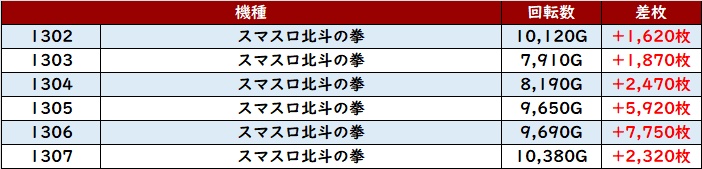 まずは「スマスロ北斗 1302~1307」がピックアップ台全台大幅プラス差枚と優秀な結果に!