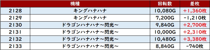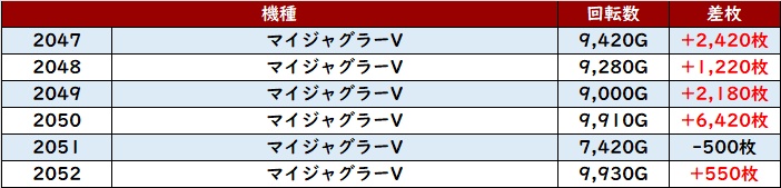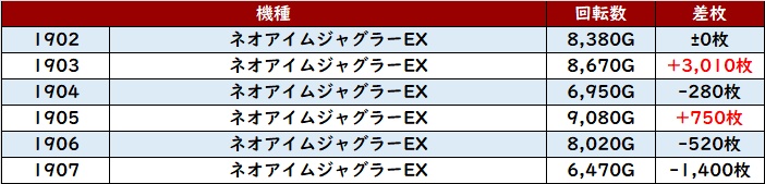 回転数1万G以上となる台が多く、その状況を背景に差枚数+9,750枚など大きな出玉感が目立った。