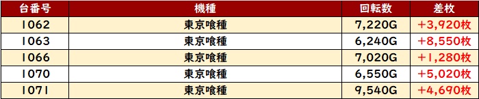 朝イチは「東京喰種」「ハナハナシリーズ」「スマスロ化物語」「モンキー5」「いざ番」の順に埋まった。