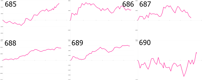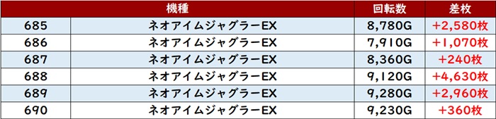 続いて「ネオアイム 685~690」が全台プラス差枚と絶好調!