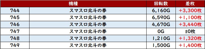 朝イチは「スマスロ北斗」「東京喰種」「スマスロゴッドイーター」「モンキー5」「スマスロ化物語」「スマスロ秘宝伝」「無職転生」が満席でのスタートとなった。