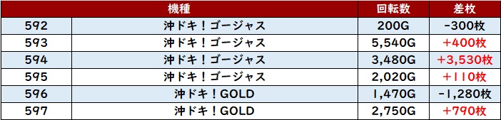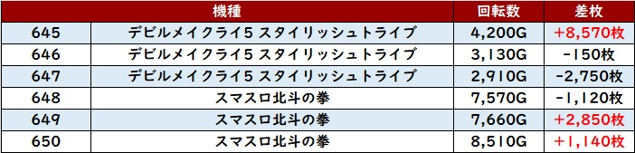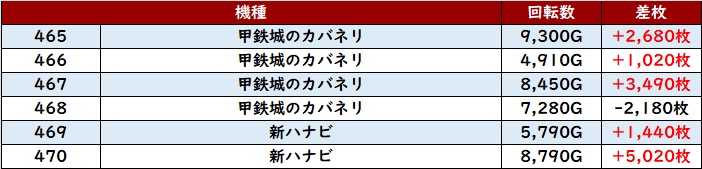 半数が回転数8,400G超えに加え、差枚数+5,020枚を筆頭に殆どが大幅プラス差枚と素晴らしい出玉感を記録した!