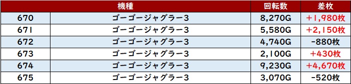 続いて「ゴージャグ3 670~675」が良好な数値に!