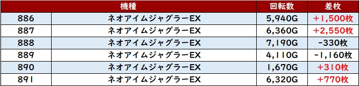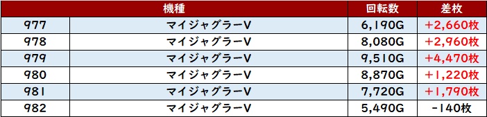 6台中5台が大幅プラス差枚を記録し、差枚数+11,980枚と頭一つ抜けた出玉感まで目撃できた。