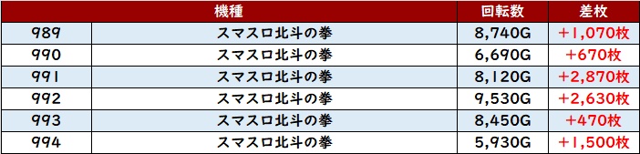 中でも「スマスロ北斗 989~994」は全台プラス差枚と素晴らしい結果を叩き出し、ユーザー達の満足度に繋げていた!