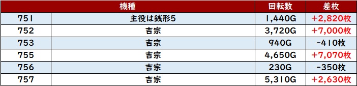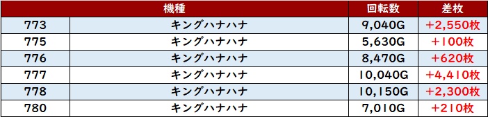 回転数1万G超えの台が複数見られる程の勢いが見られ、その稼働も相まって全台プラス差枚と大満足の結果を記録していた!