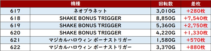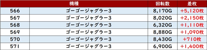 続いて「ゴージャグ3 566~571」は全台プラス差枚を記録!