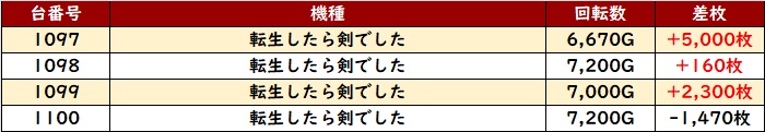 続いて「転剣」「スーパーブラックジャック」「銭形5」「ヴヴヴ2」が全台系と思しき数値を記録!