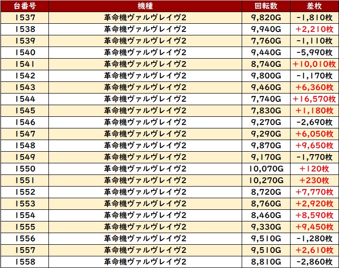 中でも「ヴヴヴ2」が朝イチから勢いづいており、殆どが回転数9,100G超えに加え、差枚数+1万枚超えが複数見られるなど、終日大熱狂となった!
