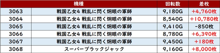 まずは「乙女4~スーパーブラックジャック 3063~3068」が差枚数+10,780枚を筆頭に差枚数+4,700枚超えが続出!