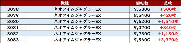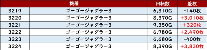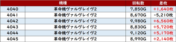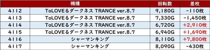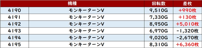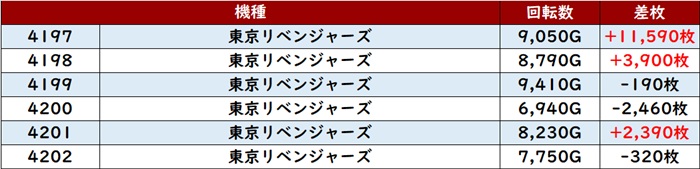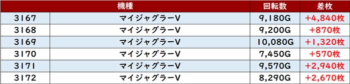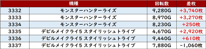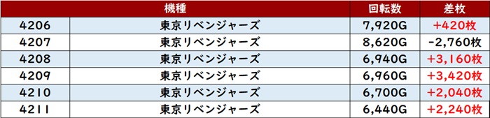 こちらも常に高稼働をキープしており、その結果差枚数+5,100枚超えが大半を占める素晴らしい結果となった。
