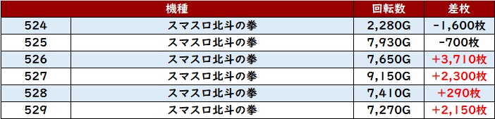 まずは「スマスロ北斗 524~529」の半数以上が回転数7,200G超えの高稼働に!
