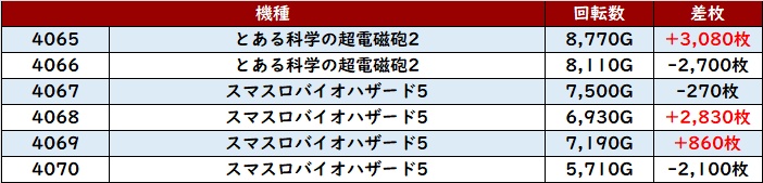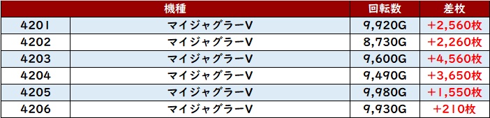 まずは「マイジャグ5 4201~4206」が全台プラス差枚と素晴らしい結果に!