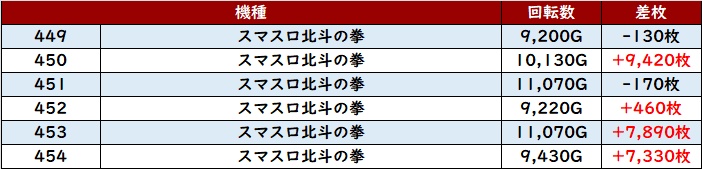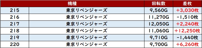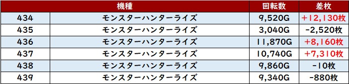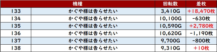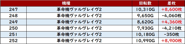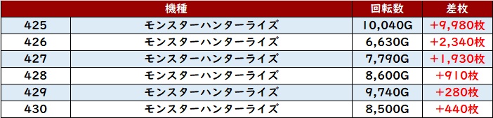 差枚数+15,320枚を筆頭に殆どが差枚数+3,000枚と凄まじい数値を誇っていた。