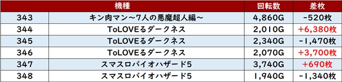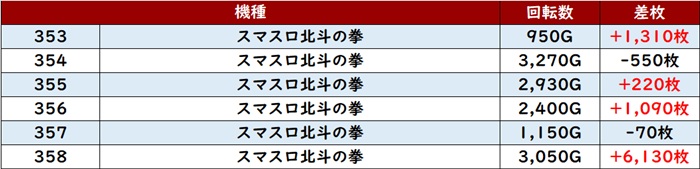 続いて「スマスロ北斗 353~358」は優秀な数値で盛り上がりに大きく貢献!