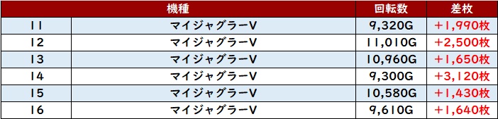 まずは「マイジャグ5 11~16」全台大幅プラス差枚と文句無しの出玉感に!