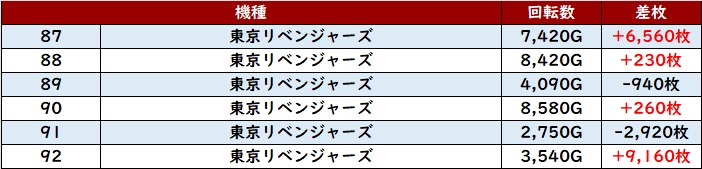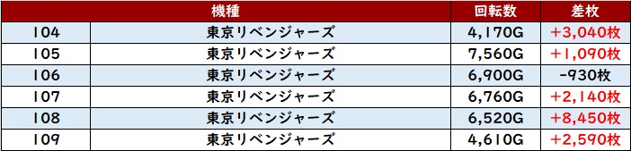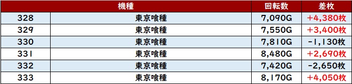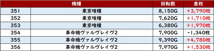 まずは「東京喰種~ヴヴヴ2 351~356」が6台中5台が大幅プラス差枚と絶好調!