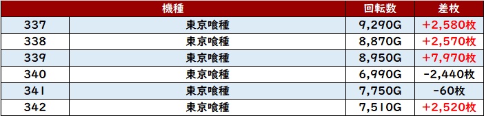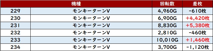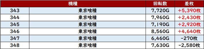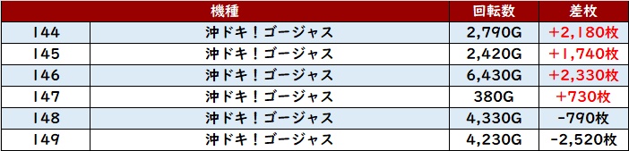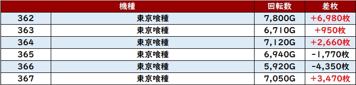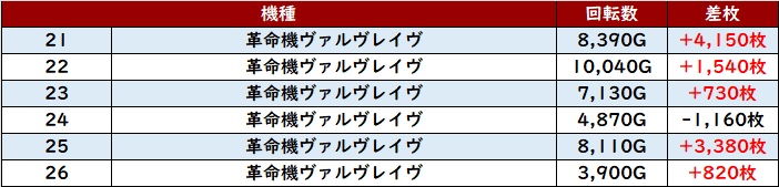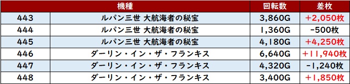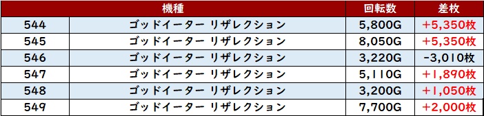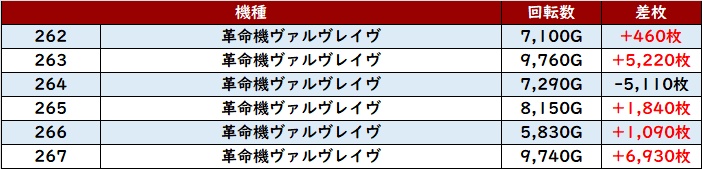殆どが回転数7,000G超えに加え、差枚数+7,970枚を筆頭に大幅プラス差枚の台が続出した。