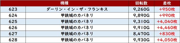 また「ダリフラ~カバネリ 623~628」が全台プラス差枚に!