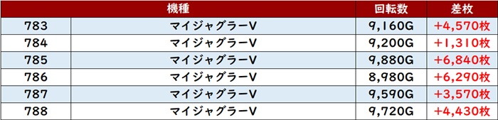 まずは「マイジャグ5 783~788」が回転数8,900G超えの高稼働を記録!