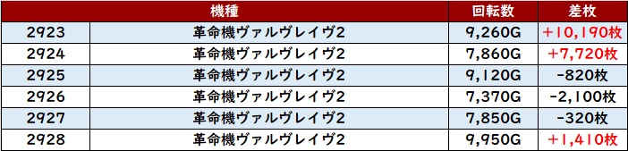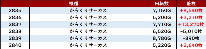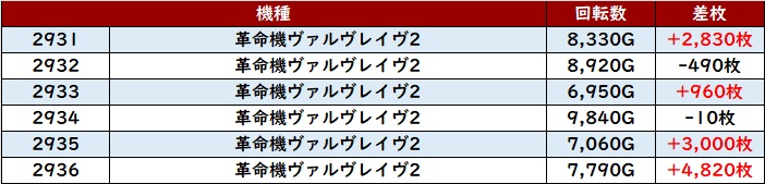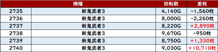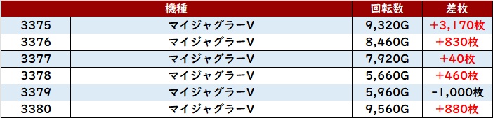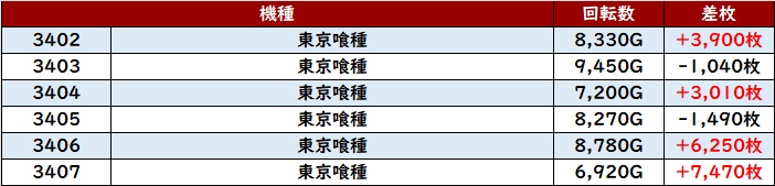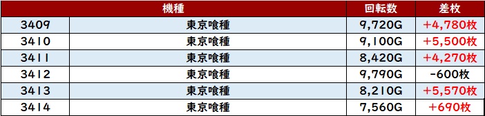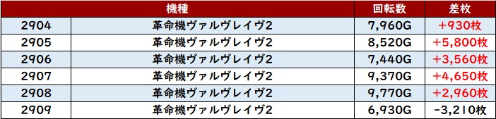 大半が差枚数+3,000枚超えと素晴らしい数値を記録し、また回転数9,100G以上の台が多く見られたことからも状況の良さは間違いなさそうであった。