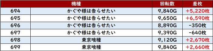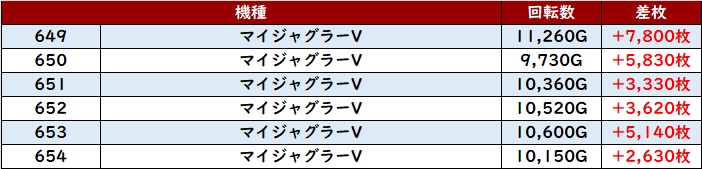 まずは「マイジャグ5 649~654」の6台中5台が回転数1万G超えと凄まじい勢いに!