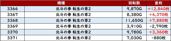 まずは「北斗転生2 3366~3371」が凄まじい出玉感に!