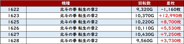 まずは「北斗転生2 1622~1628」の半数以上が回転数1万G超えの高稼働を記録!