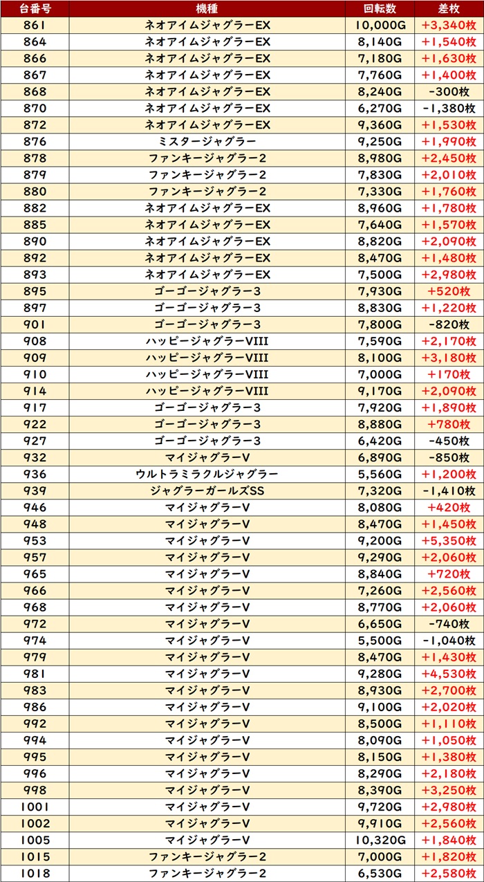 回転数8,000G超えとなる台が大半を占め、中には差枚数+18,420枚とコンプリート機能発動したかと思われる台も見受けられた!
