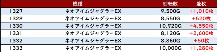 まずは「ネオアイム 1327~1333」が全台プラス差枚と安定感抜群の結果を披露!