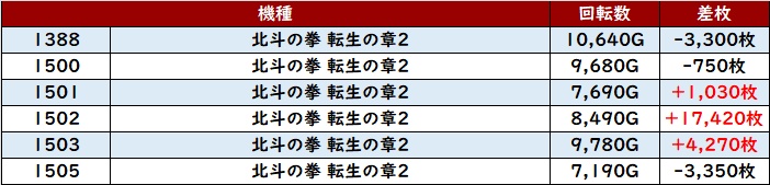 続いて「北斗転生2 1388~1505」から差枚数+17,420枚と圧巻の出玉感を目撃!