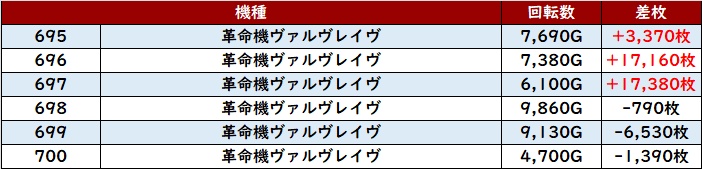 回転数1万G超えの台が複数見られ、状況が良くなければ到達しないような稼働の高さを記録していた。