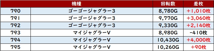 更に「ゴージャグ3~マイジャグ5 790~795」が6台中5台がプラス差枚に!