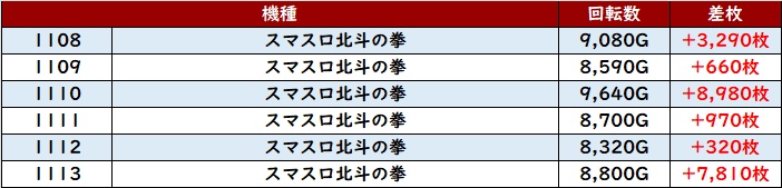 まずは「スマスロ北斗 1108~1113」が全台プラス差枚と安定感抜群の結果に!